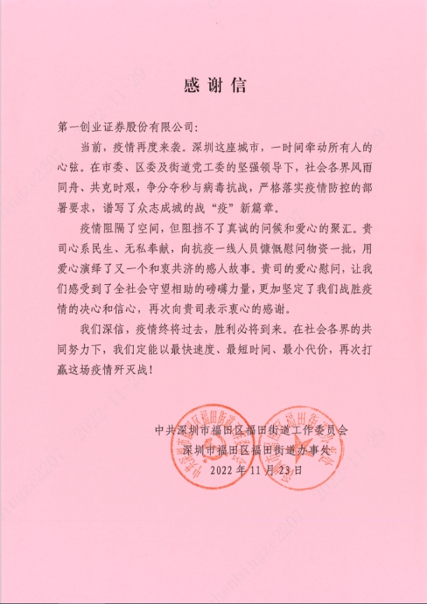2022年11月,深圳的疫情再一次爆发,严重侵害了社会民众的健康安危。在此紧张时刻,防疫人员再次投身在抗疫一线,坚守岗位毫不动摇。公司积极履行社会责任,向奋战在抗疫一线的街道、社区工作人员送去慰问,并通过“深圳市第一创业公益基金会”(以下简称“基金会”)捐赠公益爱心物资。
